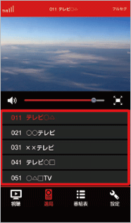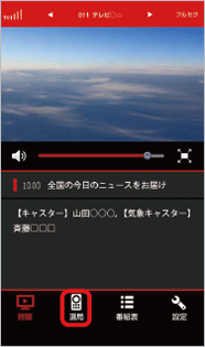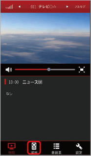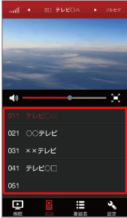 テレビの映像を表示します。 左右にフリック→任意のチャンネルをタップと操作すると、チャンネルを切り替えられます。タップすると音量調節バーなどのメニューを表示/非表示にできます。 |