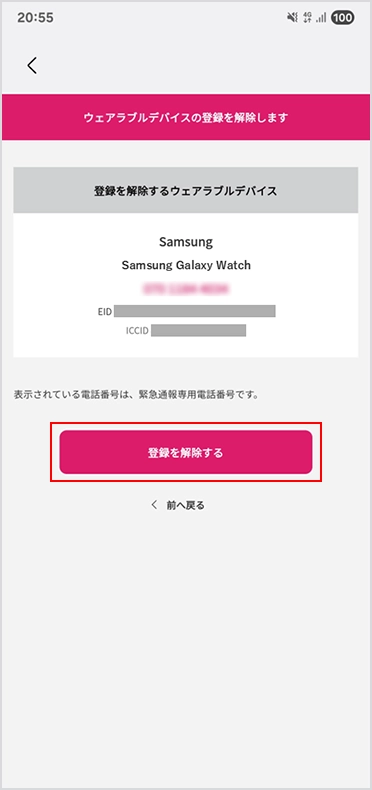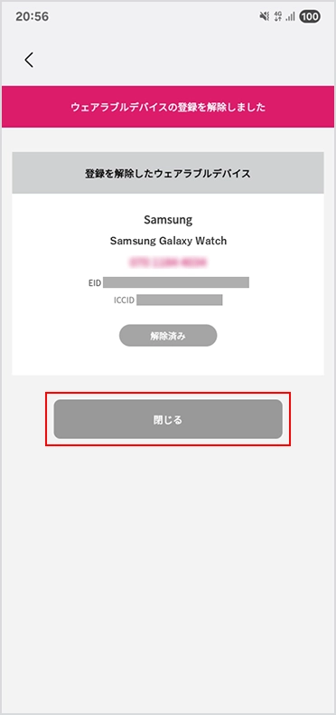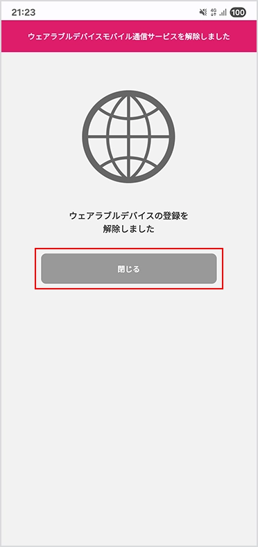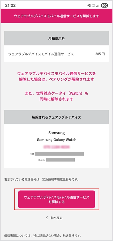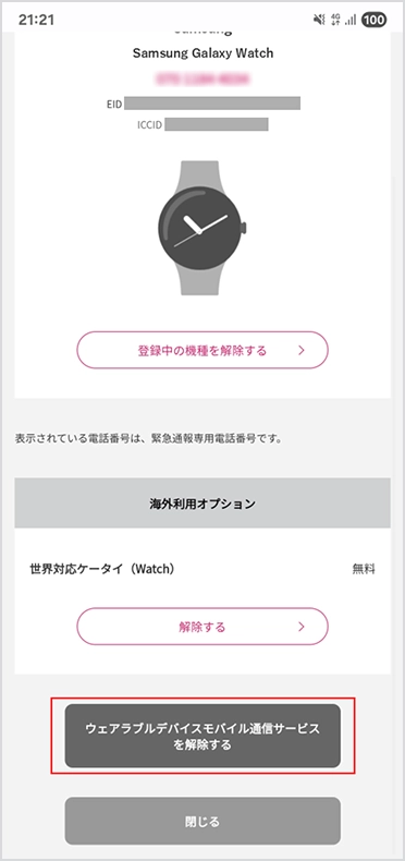 「ウェアラブルデバイスモバイル通信サービスを解約する」を選択