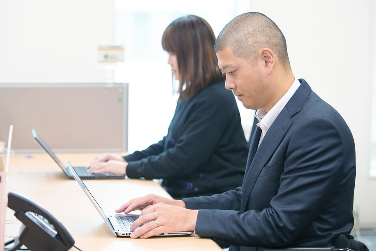 私はハウスメーカーで現場監督に従事していたのですが、社会人1年目の時に事故に遭い、車いす生活を送ることに。それからスポーツ用品店の店頭販売員としてアルバイトをしていましたが、「このままではいけない」と就職を考え、ソフトバンクに応募しました。正直に話すと、当時は福岡ダイエーホークスをソフトバンクが買収したというニュースを知っていたくらいで、どんな事業を行っている会社なのかはあまり分かっていませんでした。でも入社したらとてつもなく優秀な人材の集まりだということに気付き、負けず嫌いの闘争本能に火が付いたんです。学生時代は野球をやっていて入社するまでパソコンすら触ったこともなかった私ですが、充実した研修プログラムのおかげで今こうして活躍することができています。自分を変えてくれたのはこの会社のおかげなので、今は後悔しないためにも、勉強、勉強の日々。また、私は障がい者だからと言って特別扱いされることが大嫌いなのです。実際に管理職として仕事を任されていることも一つの証明になりますが、職場では全く特別扱いされることなく働けます。意見も言いやすく、チーム力のある良い環境だと思います。