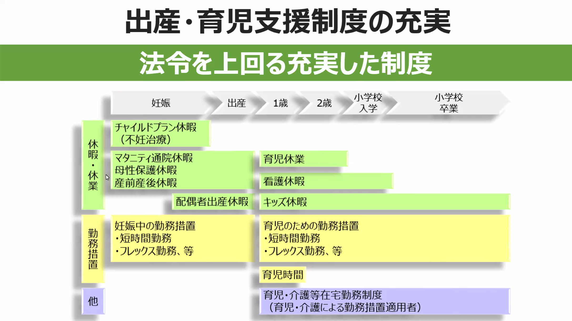 復職を後押しするのは、ソフトバンク独自の制度。女性活躍を促進するためにさまざまな法令が定められていますが、ソフトバンクではそれを上回る支援が充実しています。
