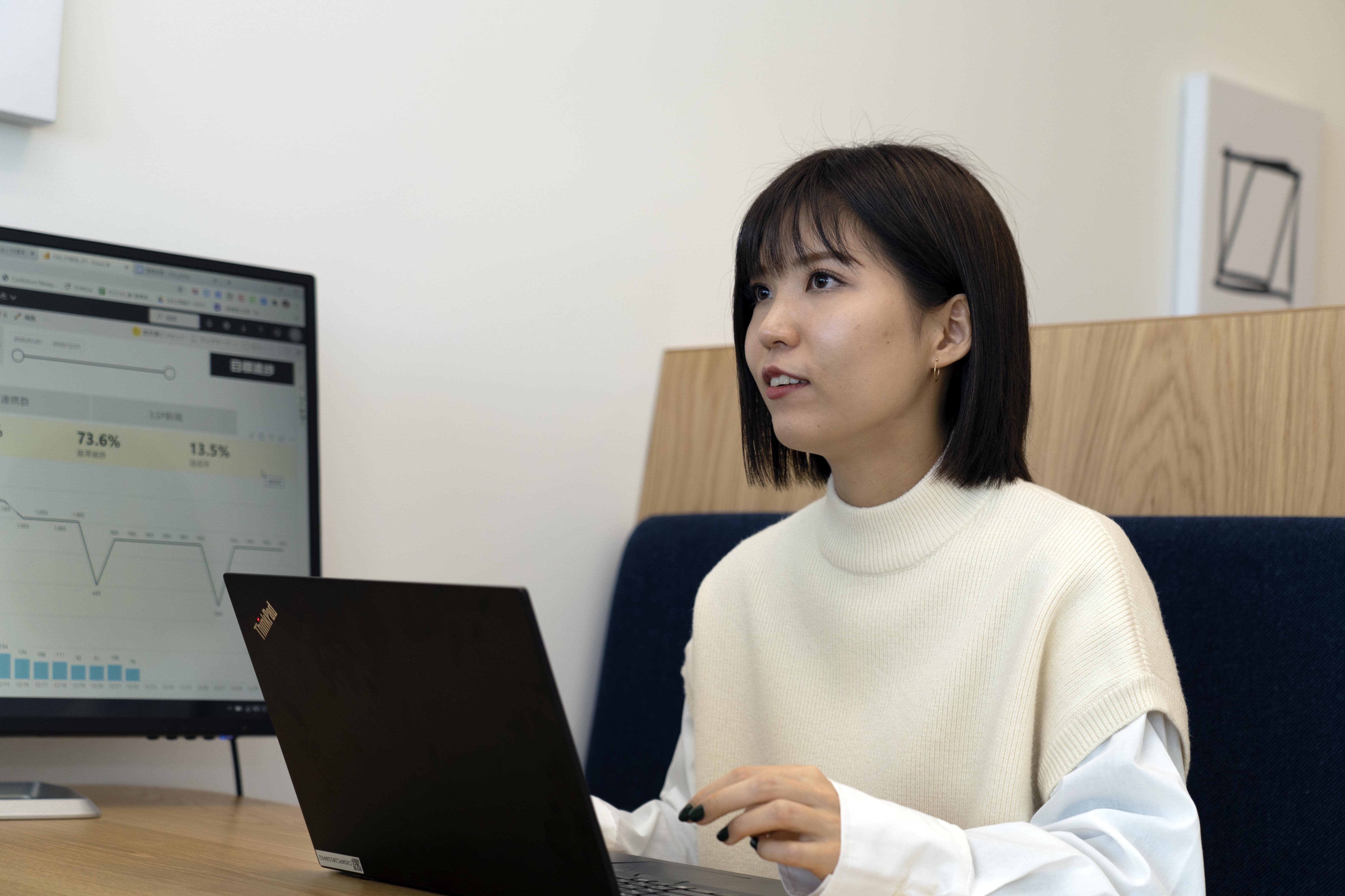 現在担当しているのは売上規模が大きい企業ですが、当初、データの収集と分析が十分に進んでいませんでした。そのため私は、日々過去のデータ収集から分析ツールの整理、業務効率化といったさまざまな点で支援を行っています。また、ソフトバンク以外の商品やサービスも多数扱っているため、ソフトバンクのプロモーションを実施していない期間があります。その期間には過去に契約したお客さまへのダイレクトメールの送付を提案するなど、こちらからも新たな施策の実施を働きかけています。