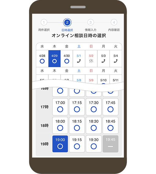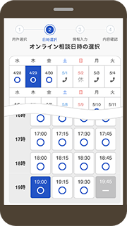 - ご相談のお時間の目安は30分です。内容により前後いたしますので、余裕のある時間帯でご利用ください。